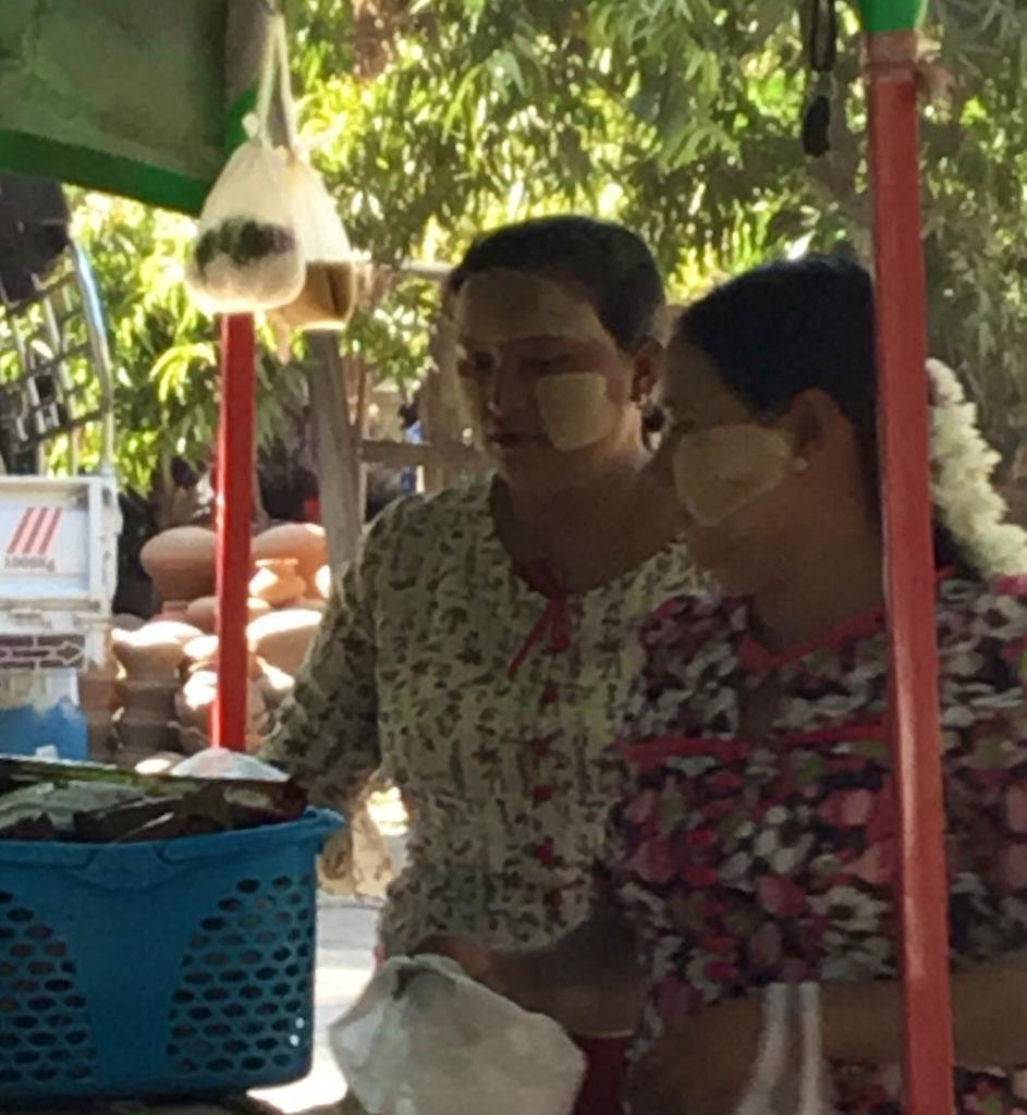 The chalky swirls you see on the cheeks of women and children are caused by thanaka, a cosmetic paste made from the bark of selected trees. It is said to keep skin smooth and protect against sun damage.