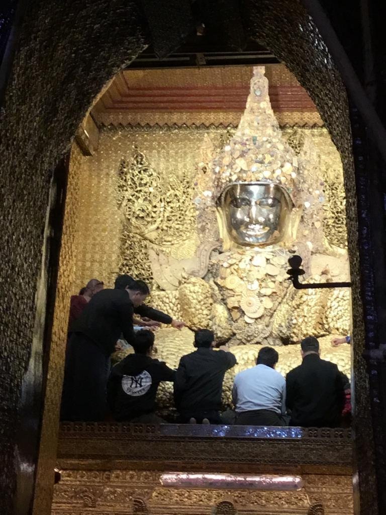 To pay respect to the Buddha image, male devotees apply gold leaf to the image, but to my dismay, women are not allowed anywhere close to the shrine. As a result, the Mahamuni Buddha is covered with a thick layer of gold leaf of about 15 centimetres, which has distorted the shape of the image.