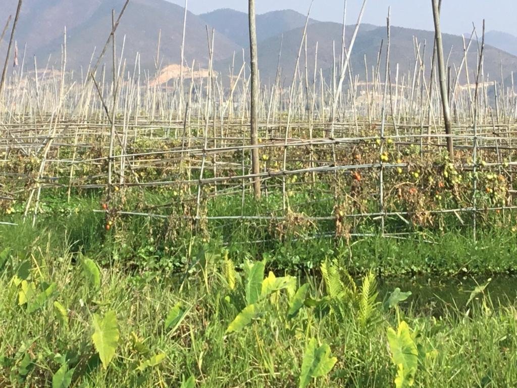 Farming on Inle Lake is unique – farmers grow tomatoes and other horticultural crops on masses of floating roots on top of the lake. These “floating gardens” are made of water hyacinth tubers heaped with sediment to form small floating islands. Eggplant, squash, and string beans are grown on the islands, but tomatoes are the primary crop, since they are the most lucrative. Farmers grow two seasons of tomatoes every year And supply it all over the country