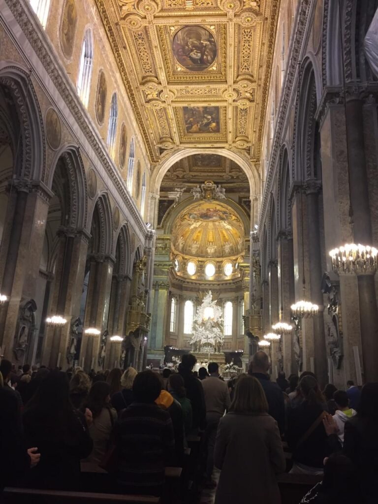 Suddenly I see a decorative pole and stopped to look at it My Russian lady signals walking up the stairs and we r in the Naples Cathedral with a full fledged Easter Mass in progress . Later I was told that this is the cathedral of Saint Gennaro the most worshipped Saint in Naples.