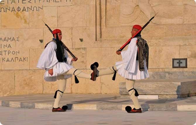 The Greek Presidential Guard or Evzones are a group of elite Greek soldiers who are trained to perform various ceremonial duties and guard at the Tomb of the Unknown Soldier and the Presidential Palace. Salary is 8 euros a month