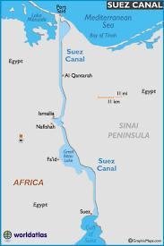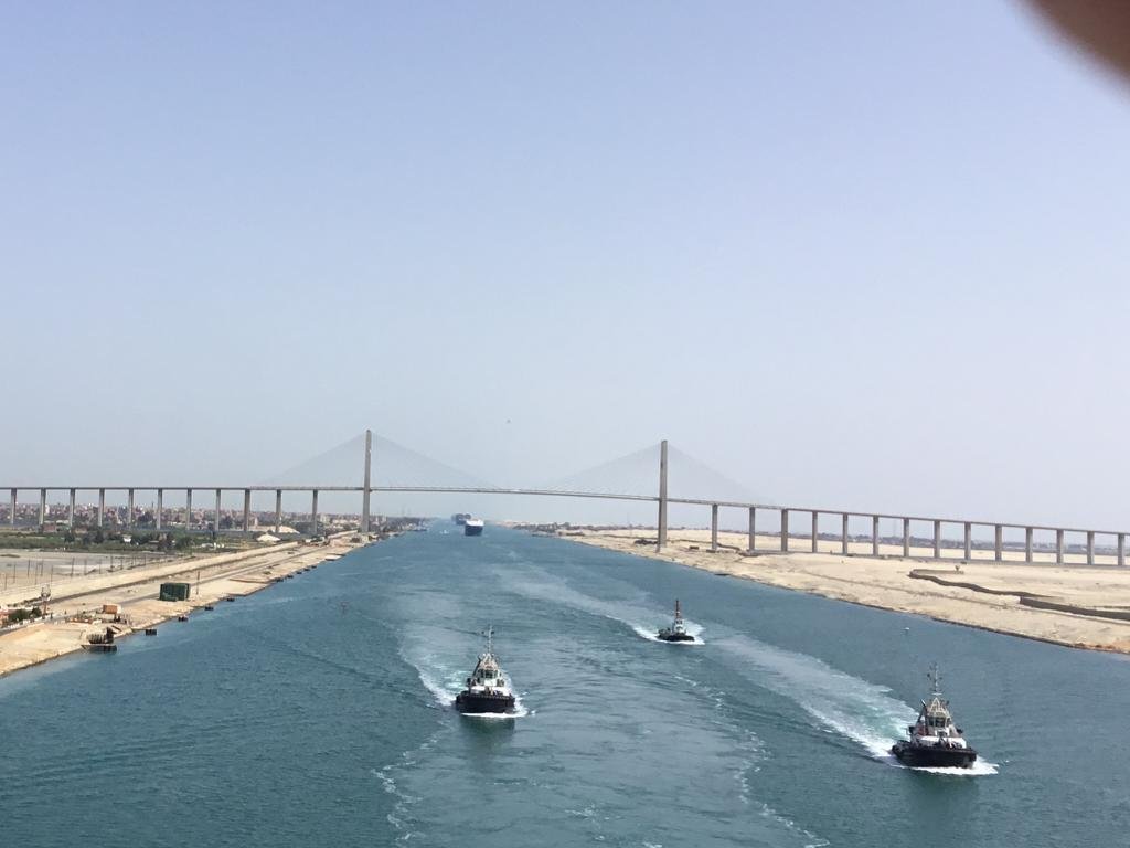 Suez Canal is an artificial sea-level waterway that connects the Mediterranean Sea and the Red Sea, thus avoiding the long route around Africa making the journey from Europe to Asia about 40% shorter. The canal is only 193 km / 102 miles long. It is mostly one way travelling in a convoy with 2-3 tug ships and 3-4 pilots .(experts at navigation in that area) Ships move at very slow speed to avoid creating waves and causing erosion , takes anywhere from 10-12 hours.